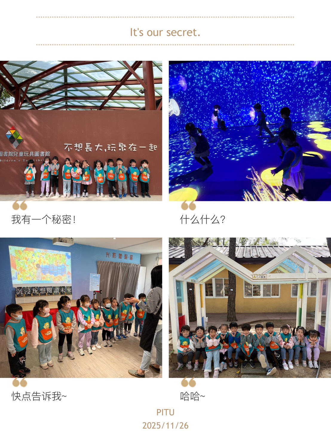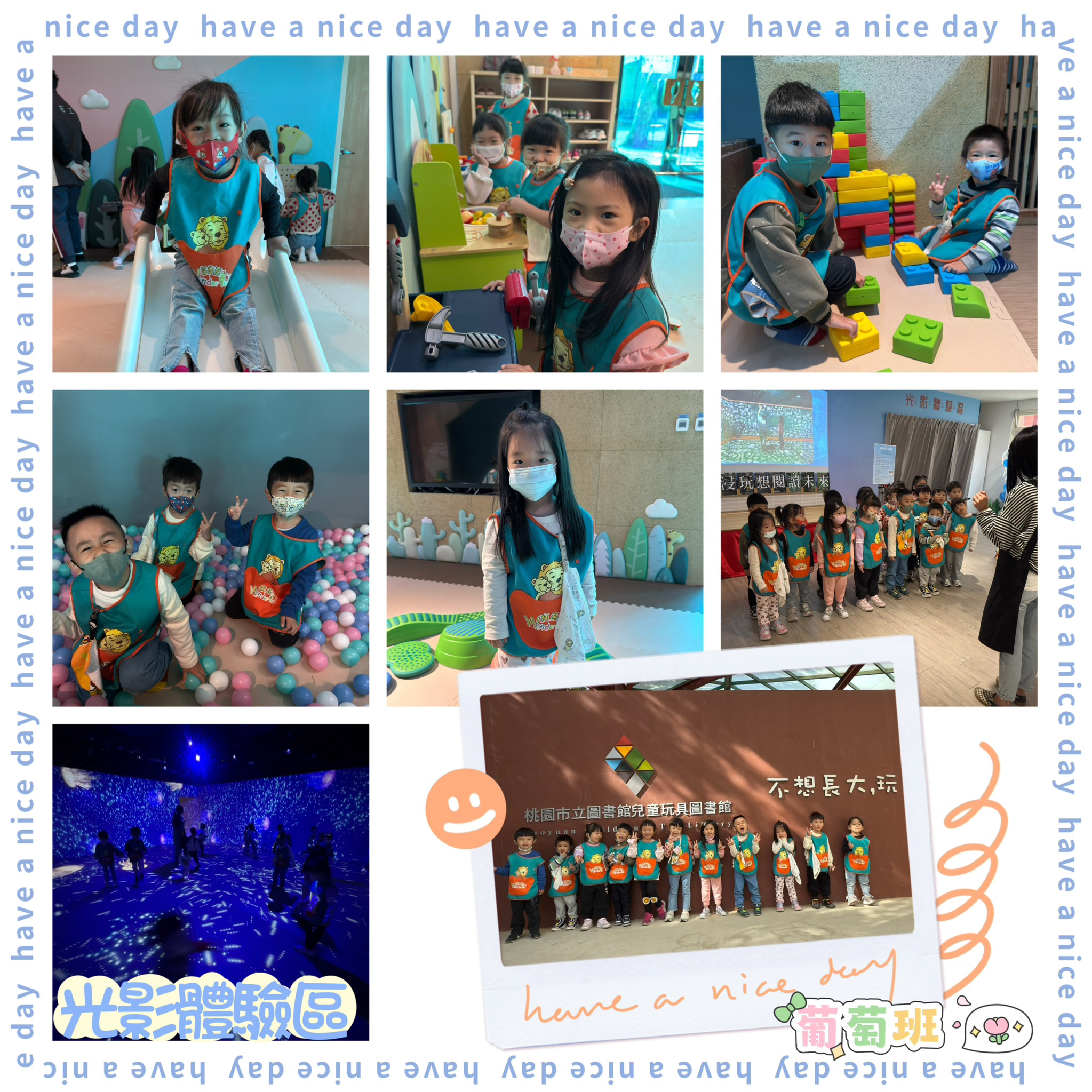 今天中班寶貝們前往「八德兒童玩具圖書館・光影體驗區」進行互動式光影探索。寶貝們透過拍手、踩步、伸手等動作與光影小精靈互動,過程中展現高度好奇與參與意願,皆能安全、愉快地完成體驗。這次活動不僅讓寶貝感受光影創作的趣味,也促進了感官刺激與動作協調,是一段充滿驚喜的學習體驗。